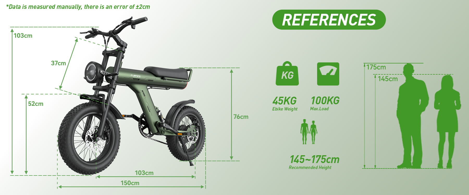Jansno X90 eBike supports riders up to 150kg and accommodates heights from 150cm to 190cm. This inclusive build means a diverse range of users can all enjoy a ride that’s both comfortable and steady.